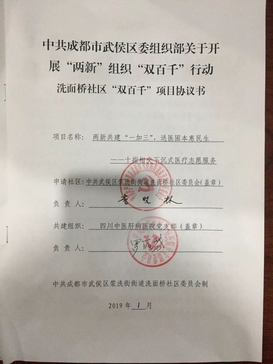 2019年1月,中共成都武侯区委组织部关于开展“两新”组织“双百千”行动,中共武侯区浆洗街街道洗面桥社区申请开展了“两新共建‘一加三’,送医固本惠民生”项目,四川中医肝病医院党支部参与共建,洗面桥社区书记李晓林与四川中医肝病医院党支部书记罗丽芬签署了协议书。