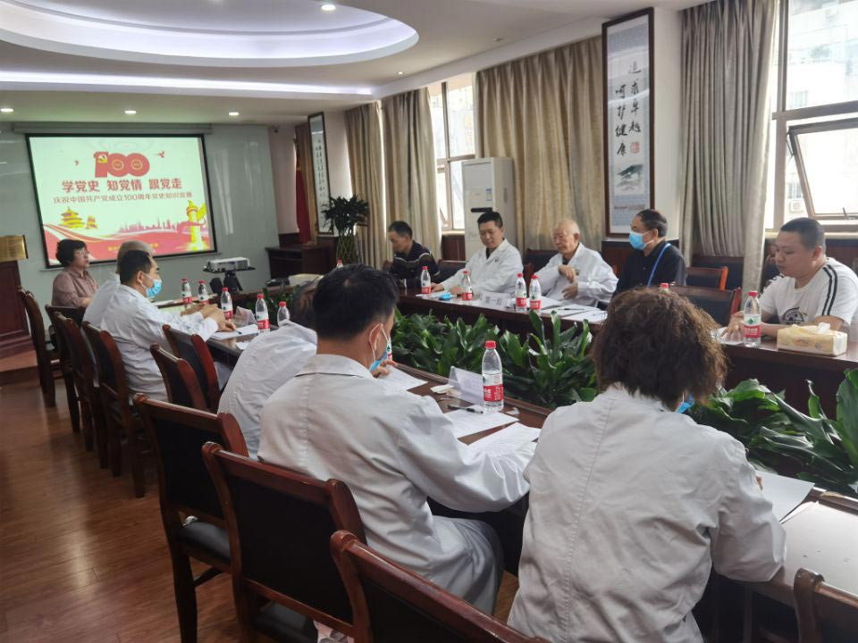 为庆祝中国共产党成立100周年,重温中国共产党光辉历程,推动全院广大职工深入扎实学好百年党史,做到学史明理、学史增信、学史崇德、学史力行,学党史、悟思想、办实事、开新局,四川中医肝病医院于4月27日下午开展“学党史,知党情,跟党走”党史知识竞赛,参与此次活动的党员干部有蜀汉街社区党委邱春书记和胡挺副书记、四川中医肝病医院党支部书记罗丽芬、四川中医肝病医院王积分院长、蔡邦镇院长等同志。